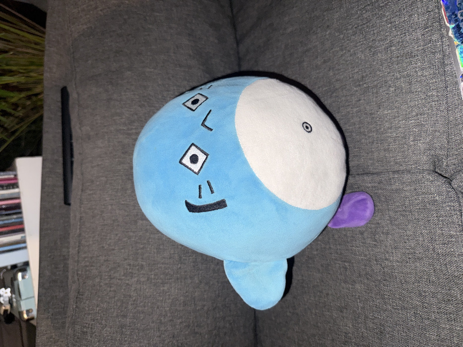 A plush toy rests on a grey couch. The toy is primarily blue, with a large white patch on one side and a small purple tail. It has a stylized face, including square eyes, a winking eye, and a smiling mouth made of lines. The couch has visible seams and varying textures. Parts of a plant are visible on the left.