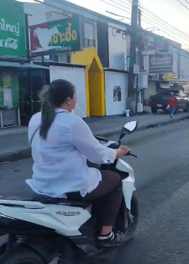 street scene in Thailand from a motorcycle's perspective. A woman on a motorcycle drives past a restaurant with a large green sign. The street is lined with buildings and various parked cars and trucks. Several people are walking along the sidewalk and crossing the street. The weather seems overcast. Electrical wires are visible overhead.