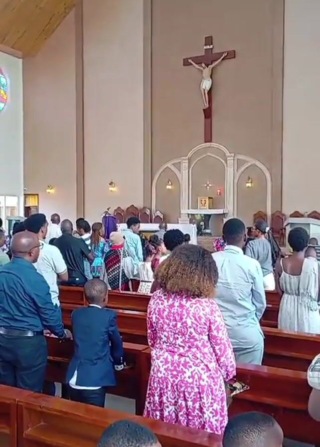 large group of people standing in the pews of a Catholic church. The church has a light wood ceiling, white walls, and wooden pews. There are stained glass windows high on the left wall. At the front of the church, behind the people, is a large crucifix with a statue of Jesus. Many people are facing the front of the church. Some of the people are wearing colorful clothing. There are several children visible in the video. Some appear to be singing.