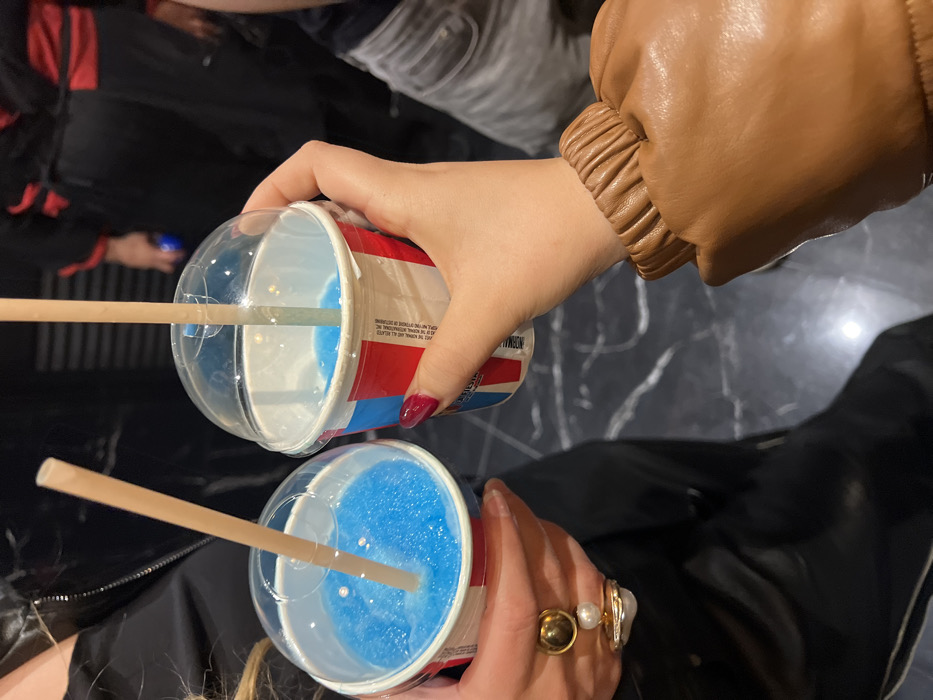 Two hands hold blue-colored slushies with straws, captured from an overhead perspective. The cups are red, white, and blue, with clear dome lids. One hand, wearing a brown leather jacket, has deep red nail polish. The other hand sports multiple gold and pearl rings. The background features black flooring and clothing.