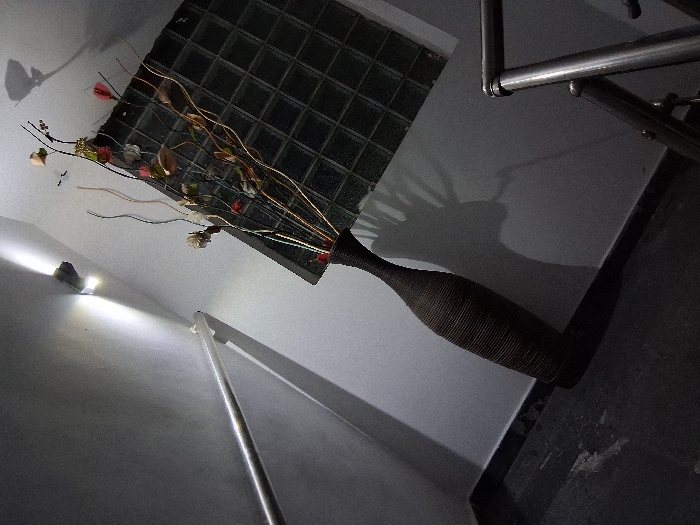 A tall, slender vase sits on a surface, containing dried floral arrangements. Behind, a window constructed with glass blocks casts an abstract shadow on the wall. The room is dimly lit, and a metal rail extends upwards on the left. In the upper right, a portion of a metal structure is visible against the dark floor.