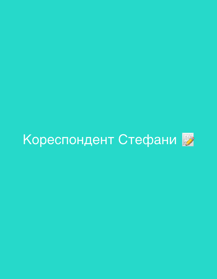 On a teal background, the phrase "Кореспондент Стефани" (Correspondent Stephanie) is written in white