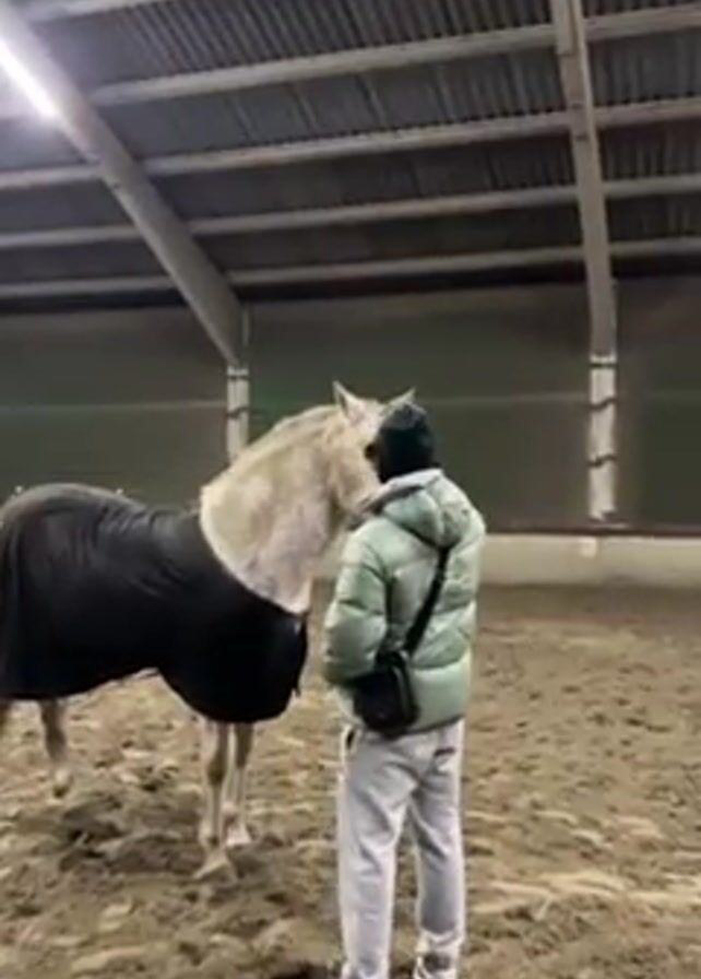 person petting a horse in an indoor riding arena. The person is wearing a light green puffer jacket, gray sweatpants, and a dark hat. They have a small black bag slung across their shoulder. The horse is predominantly white with some darker spots and is wearing a black blanket. The floor of the arena is covered in dirt and sand. The arena has a high ceiling with exposed beams and artificial lighting. The person gently pets the horse's face and neck.