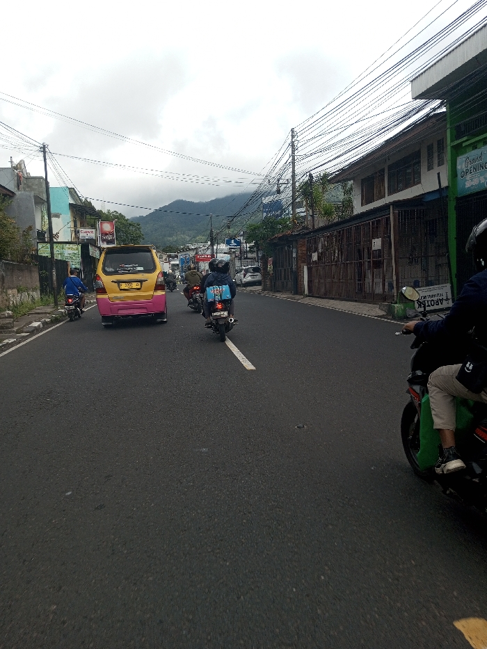 The image captures a street scene in Saing Ta Mawt Lay, Myanmar, under an overcast sky with distant mountains visible. The asphalt road surface appears dark, with a broken white lane divider line visible in the right mid-ground. In the right foreground, the left side of a dark-colored motorcycle is visible, ridden by an individual wearing light-colored pants, dark shoes, and a dark helmet. Green material is attached to the lower left side of this motorcycle. Ahead and slightly to the left, another dark motorcycle is ridden by an individual with a dark helmet and a blue backpack, positioned to the left of the white lane marker. Directly in front of this motorcycle, a two-tone van, yellow with a pink rear section, displays a license plate reading "F 5998 D" and is moving away from the viewer. To the left of the van, another motorcyclist wearing a blue shirt and helmet is present. Multiple other vehicles, including motorcycles and a white car, are visible further down the road. Buildings line both sides of the street. On the left, a light blue building is visible, followed by a gray concrete wall and other structures. Signs displaying "Canon" and "VIVO" logos are mounted on this side. On the right, a two-story building features a prominent green facade with text indicating "Grand Opening" and "2020," along with an "APOTEK" sign. Adjacent to this, another building exhibits a slatted, possibly wooden, facade. Numerous utility poles support a dense network of overhead electrical or communication wires that crisscross the scene above the street and buildings. Lush green mountains form the background, partially obscured by clouds.