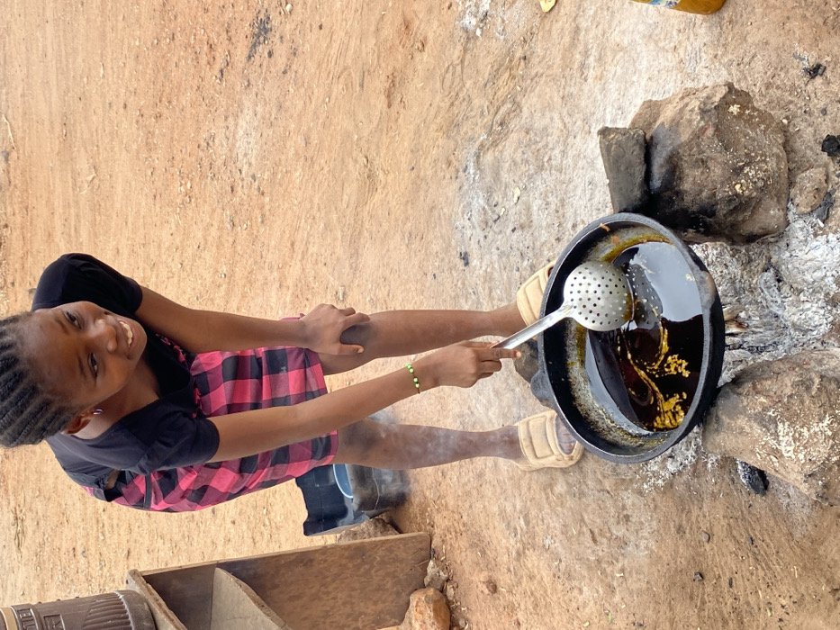 In Adankolo, Nigeria, a young female stands outdoors, leaning forward over an open-air cooking setup