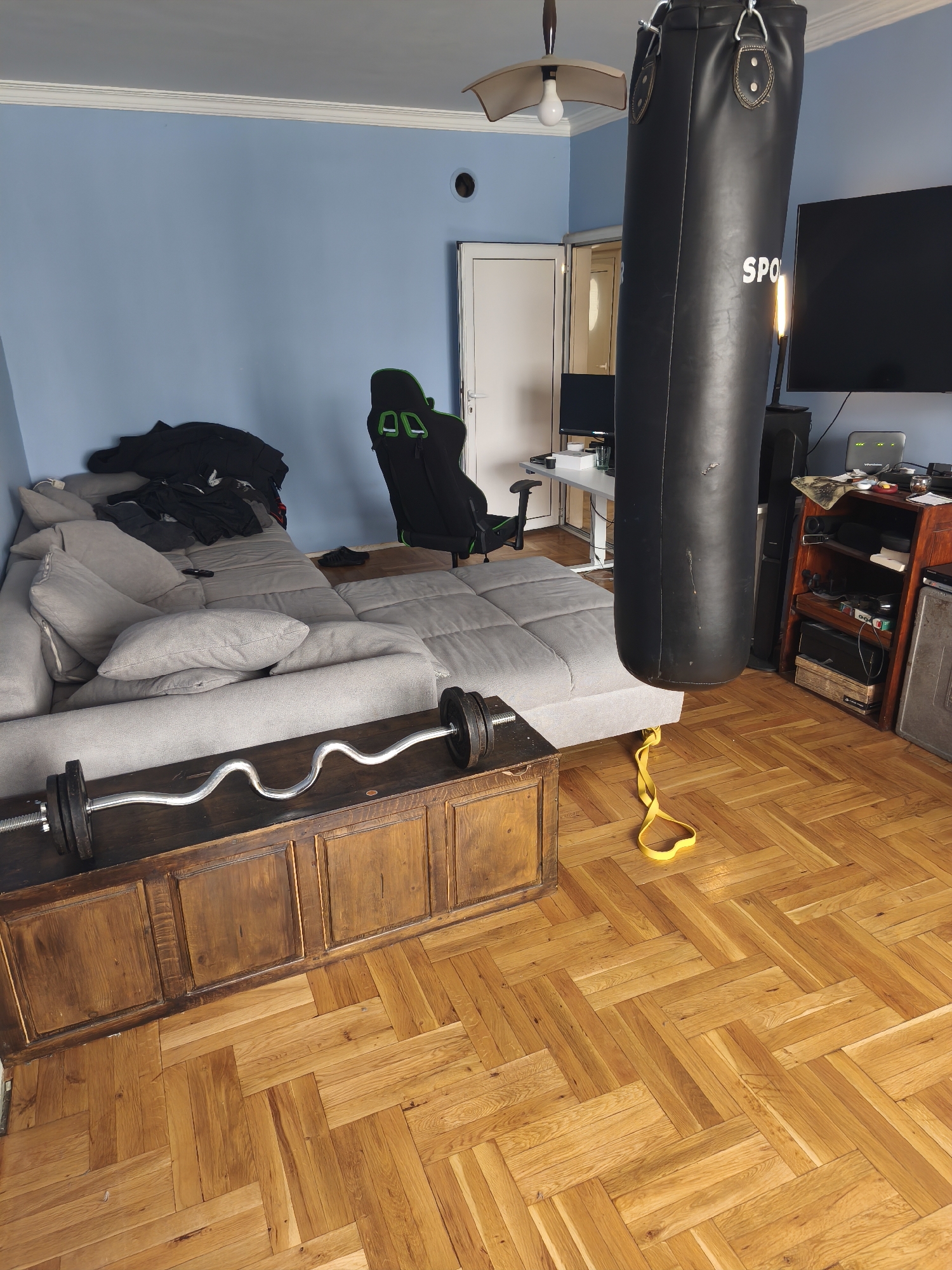 The image displays an interior residential room, potentially located in Sofia, Bulgaria, though the specific location within the city cannot be determined from the visual information. The room features light blue walls topped with white crown molding and a light brown parquet floor laid in a herringbone pattern. In the foreground, a dark brown wooden chest or low cabinet is positioned, upon which a silver EZ curl bar with black weight plates is resting horizontally. To the left, an L-shaped modular sofa in a light gray fabric occupies a significant portion of the floor space, with black clothing piled on its far end. A black remote control is visible on the sofa cushions. A black punching bag, suspended from the ceiling by chains, hangs centrally in the midground, partially obscuring a white desk to its left. On the desk, a computer monitor, an object that appears to be a cup, and other small items are visible. To the right of the punching bag, a large, wall-mounted flat-screen television is powered off. Below the television, a dark brown wooden shelving unit holds various electronic devices, including a Wi-Fi router with green indicator lights, and other miscellaneous objects. A yellow resistance band lies coiled on the parquet floor beneath the punching bag. In the background, a black gaming chair with bright green accents is positioned near a white door or doorway. A ceiling fan with a light fixture is visible near the top center of the image.