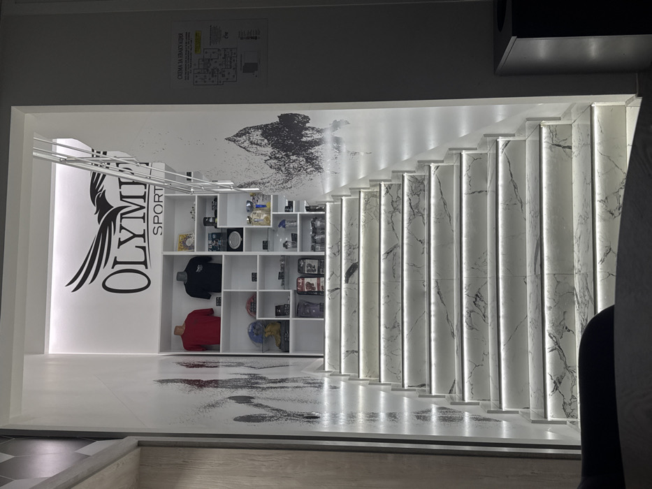 An interior view depicts a brightly lit, ascending staircase within a building identified as a location for "OLYMPIA SPORT" in Lyaskovets, Bulgaria. The central focus is a set of approximately ten steps constructed from white material with grey marble-like veining, each step illuminated by a thin, continuous LED strip positioned beneath its nosing. A white metal handrail is visible along the right side of the staircase. The walls bordering the staircase are predominantly white. The wall to the right features a dark, abstract, fragmented design resembling splatters or rough brushstrokes, extending upwards. A white sign labeled "СХЕМА ЗА ЕВАКУАЦИЯ" (Evacuation Scheme) in Cyrillic is affixed to the upper right section of this wall. The wall to the left is partially visible, appearing lighter, possibly a wood panel or a plain white surface with minimal texture. At the top of the staircase, on what appears to be a landing or upper level, a large black logo is prominently displayed on a white wall, featuring an eagle design above the text "OLYMPIA SPORT." Below this logo, an array of white modular shelving units holds various merchandise and awards. Specific items include two mannequin torsos displaying a red t-shirt and a black t-shirt. Other shelves contain sports equipment such as a basketball, boxing gloves, a golden trophy, various bottles and containers (possibly supplements), smaller plaques, and other retail items. No individuals are present in the scene. In the immediate foreground, at the bottom of the stairs, dark, indistinct shapes suggest a seating area or furniture, and a dark waste bin is visible on the far right.