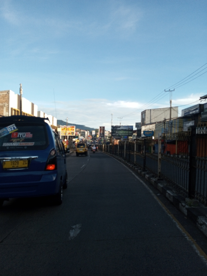 The image displays an urban street scene in Khouathineung, Laos, under a clear daytime sky with scattered clouds. The perspective is from behind a vehicle, looking down an asphalt road that curves slightly to the right in the distance. In the immediate foreground, the rear of a dark blue van/minivan is prominent, featuring a yellow license plate marked "F 1928 ZG" and several stickers on its rear window, including one displaying "021" and others with text in an Indonesian language. The van's brake lights are off. Further down the road, a yellow passenger car and multiple motorcycles are observed in motion, indicating active traffic. To the right of the road, a dark metal pedestrian barrier runs along a curb with black and white stripes, behind which commercial structures with various advertisements and utility poles supporting overhead power lines are visible. On the left side of the road, a series of multi-story commercial buildings line the street, one featuring a distinct spire-like architectural element on its roof. Numerous large billboards and commercial signs are present along both sides of the thoroughfare. Distant hills or mountains form the backdrop on the horizon.