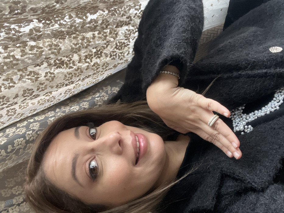A female subject is depicted in a close-up, indoor shot. She possesses fair skin, brown eyes, and long, dark brown hair. Her expression is characterized by a slight smile, with her gaze directed at the camera. She is wearing visible facial makeup, including eyeliner, mascara, and a light-colored lip gloss. The subject is dressed in a black, fuzzy-textured outer garment, likely a cardigan or jacket. Beneath this, a black undergarment is visible, adorned with white, spherical embellishments arranged in a pattern across the chest area. Her left hand is raised, with fingers slightly bent, resting against her chest. On the ring finger of her left hand, two stacked rings are present, appearing as bands possibly encrusted with small stones. A bracelet, featuring a chain of circular, light-colored elements, encircles her left wrist. A single round, gold-toned button with an embossed design is visible on the right side of her outer garment. The background consists of patterned textile, identified as drapery or curtains. This material displays a light brown or beige base fabric with an interwoven or printed pattern of darker brown floral or foliage motifs. The lighting suggests an interior environment. There are no discernible visual cues within the image to indicate the city of Caen, France, or any other specific geographical location.