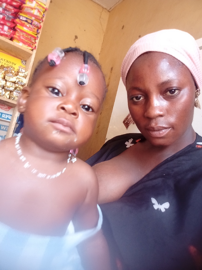 The scene is an interior space, likely a small retail shop or storage area, located in the city of Unknown, Unknown. A dark-skinned adult female occupies the right side of the frame, wearing a light pink ribbed headwrap and a dark garment adorned with white butterfly patterns. An ornate gold-colored earring is visible on her right ear. She maintains a neutral expression, looking directly at the viewer. To her left and slightly in front, a dark-skinned child, likely a toddler, is held or positioned close. The child has two small braids on the forehead, each adorned with a clear plastic bead, and wears a white beaded necklace. White residue is present around the child's mouth and chin. The child also looks directly at the viewer with a neutral expression. The background features a light brown wall with visible cracks and blemishes, and a multi-tiered shelving unit on the left, stocked with various packaged food products and other goods.