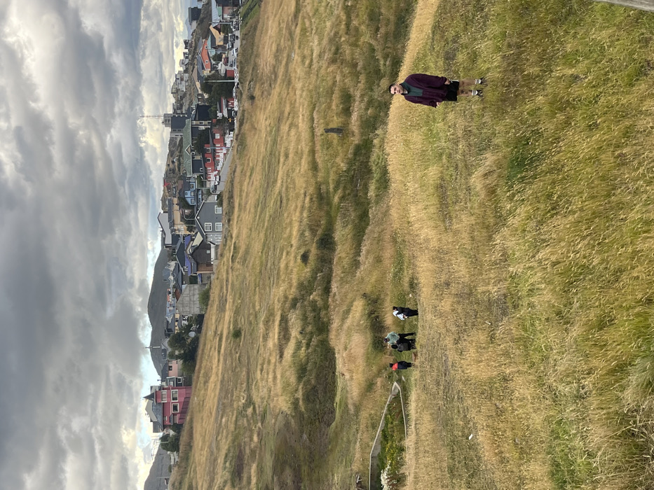 The scene depicts a wide outdoor vista in Ushuaia, Argentina, under an overcast sky with dense grey clouds. The foreground and midground consist of a gently undulating hillside covered predominantly in tall, dry, yellowish-green grass. A small, partially visible concrete-edged structure, possibly a planter or retaining wall, is present in the lower-mid-left. In the mid-ground, a group of four individuals is congregated within a slight depression of the terrain. One individual wears a light green jacket, another a dark top with red trousers, and two others are in dark clothing; their exact actions are indistinct due to distance, but they appear gathered in close proximity. To the right in the foreground, a lone young male stands facing directly towards the camera, his mouth slightly open. He is dressed in a dark maroon long-sleeved pullover over a visible green layer, black shorts, and dark athletic shoes with white socks. The background features a dense urban settlement of Ushuaia, built across multiple hillsides. Numerous residential buildings display varied architectural styles and prominent colors, including pink, red, blue, grey, and green. Roads wind through this urban area, with parked vehicles visible along their edges. Distant hills, some topped with communication towers, form the horizon, partially obscured by the heavy cloud cover.