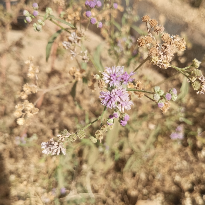 The image displays a close-up view of a herbaceous plant featuring small, composite flowers, located in Barakin Sabawa, Nigeria. The foreground and midground are dominated by the plant, which exhibits clusters of tiny, light lavender to purple florets, some in full bloom and others as developing buds. Interspersed with the fresh blooms are numerous dried, brown flower heads or seed pods, indicating various stages of the plant's life cycle. The stems supporting these structures are thin and green. The background is out of focus, showing light brown, dry, and possibly sandy soil with sparse, indistinct patches of faded green vegetation, characteristic of an arid or semi-arid environment. The scene is illuminated by natural light. No human figures, animals, or man-made objects are present.