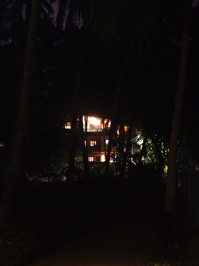 The image displays a multi-story building, likely a residence or guesthouse, illuminated at night amidst dense tropical foliage in Querim, India