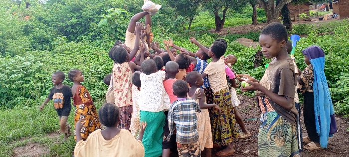 A group of children reach for a bag held high by an adult. They are dressed in a variety of clothing, some barefoot. Some have their hands raised, hoping to receive something from the bag. To the right, a girl holds green fruit. The area is rural and the ground appears muddy. Trees and shrubs are in the background.