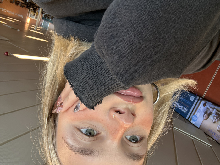 A young female, characterized by light skin, visible freckles on her nose and cheeks, and light brown shoulder-length hair, is depicted in a close-up portrait. She has green eyes and her lips are coated with a pinkish gloss. A silver-toned hoop nose ring is present in her left nostril, and a large silver-toned hoop earring is partially visible in her left ear. Her right hand is raised, with the palm facing inward, resting against her right cheek/chin area. The fingernails on her right hand are long and manicured with a translucent design featuring abstract pink, purple, and grey patterns. She wears a dark grey or black hooded sweatshirt, the right sleeve cuff of which exhibits a frayed or distressed edge. The background indicates an interior public space, identified as the Tsawwassen Ferry Terminal in Delta, Canada. To the upper left, a digital display screen shows fragmented advertisements, including text such as "ESCAPES" and "UNLIMITED DATA AND SOFTWARE," against a reddish-brown paneled wall. To the upper right, the environment transitions to a wider perspective of the terminal interior, featuring a high ceiling with strip lighting fixtures. In the distant background, a sign is partially visible, reading "...Spirit of British Colum...", which is a reference to BC Ferries' "Spirit of British Columbia" vessel, confirming the ferry terminal location.