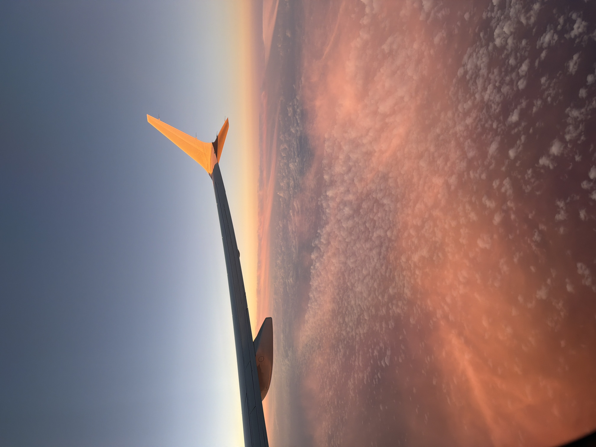 A view from an airplane window shows the wing of the aircraft, which is gray and has orange flaps. The sky on one side of the wing is clear and blue, while the sky on the other side is filled with pink and gray clouds. The angle of the photo is askew, as the image appears to be rotated. The location is unknown.