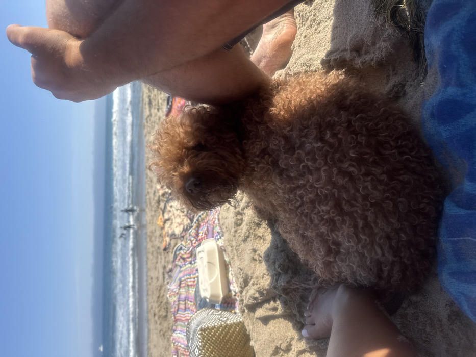 The scene depicts a sandy beach in Malibu, United States of America, under clear daylight conditions. In the immediate foreground, a medium-sized, reddish-brown curly-haired dog is seated on the sand, facing away from the camera towards the ocean. Adjacent to the dog, portions of two human individuals are visible: a bare left foot with white-painted toenails is partially buried in the sand to the dog's left, and a pair of crossed bare legs with a visible right foot are present to the dog's right. A blue towel or blanket is visible beneath the dog and human feet. On the sand behind the dog, a colorful, striped blanket is spread, accompanied by a light-colored woven container and a beige rectangular takeout container with a lid. In the midground, the Pacific Ocean features gentle waves, with two human figures silhouetted in the shallow water, appearing to be standing or wading. A boat is visible in the far distance on the ocean's surface to the left. The background consists of a clear, bright blue sky meeting a hazy horizon line over the ocean.