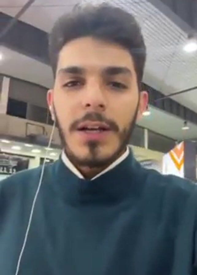 A young man with a beard and dark hair is recording a selfie-style video. He is wearing a dark teal turtleneck sweater and white wired earphones. He is indoors, in what appears to be a large event space, with a high ceiling and visible lighting fixtures. In the background, there are glimpses of booths and other people. The man is looking into the camera and speaking.