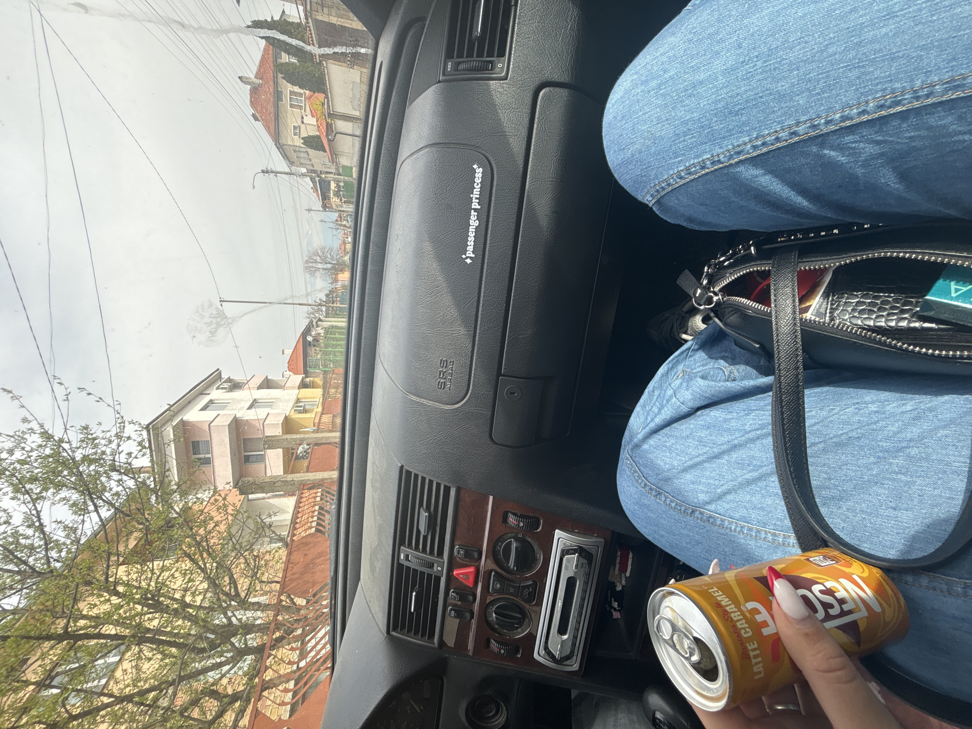 The photo shows an interior view from the passenger seat of a car in Banya, Bulgaria. In the driver's view is a street with buildings. The passenger is wearing blue jeans and holding an opened can of Nescafé Latte Caramel. A black purse is sitting on their lap. The dashboard includes a "passenger princess" label and a wood-grain trim.