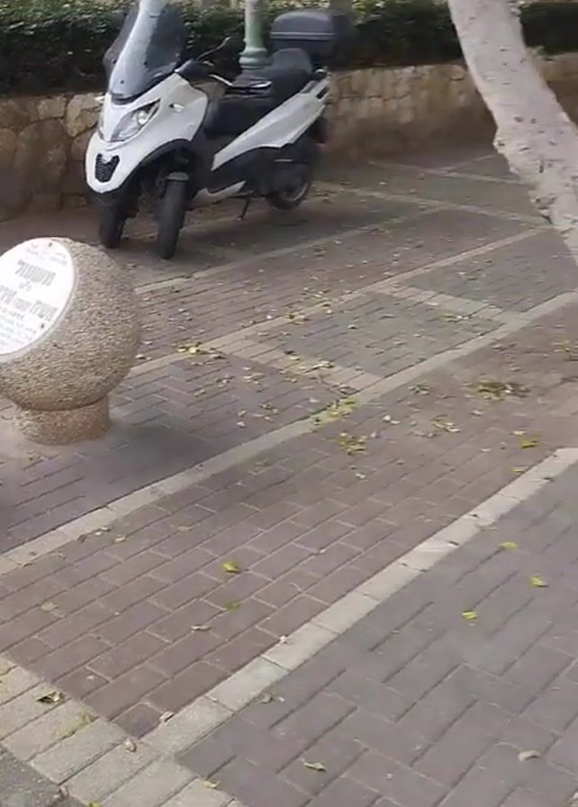 n outdoor scene with cats on a brick walkway. The first shot shows two black cats near a rounded stone monument. A white scooter is parked in the background. The walkway is covered with fallen leaves. The camera pans to the right to show another cat, calico in color, moving behind a tree. The camera continues panning to the right, and a black cat is sitting near a wall, looking towards the camera. The area has trees and parked cars lining the street in the background.
