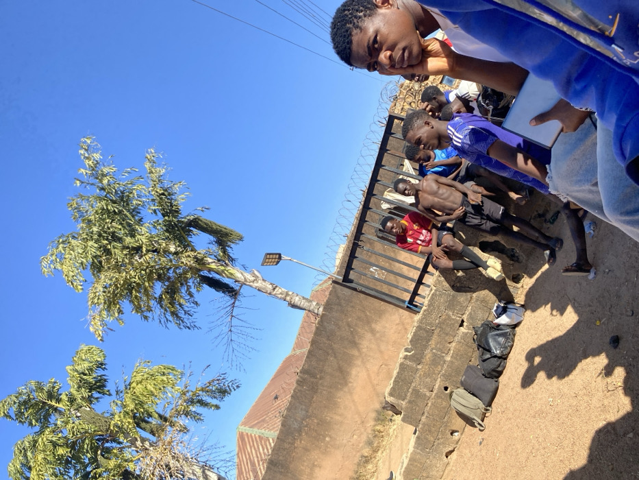The image depicts a bright, sunny outdoor scene in Barakin Akawo, Nigeria, featuring a group of young males gathered on a dirt-covered ground adjacent to a low, multi-tiered concrete wall. In the background, a light-brown stucco or painted wall is visible, topped by a weathered corrugated metal roof and a dark metal gate secured with razor wire. Two tall palm trees with green foliage stand prominently against a clear blue sky, one with a solar-powered street light attached to its trunk. Approximately eight to ten young males, appearing to be teenagers or young adults, are present. In the immediate foreground, to the right, a male wearing a blue hooded sweatshirt is partially visible, holding a light-colored tablet or book in his lap. He looks towards the right. To the left, on the ground, two backpacks—one olive green and one black—are positioned. Further back, seated on the low concrete wall, are multiple individuals. From left to right: one male wears a red and yellow striped football jersey with black shorts and long black socks; next to him, a shirtless male wears dark shorts. Other individuals in various attire, including blue and purple shirts (some striped, possibly football jerseys), are visible standing or leaning near the concrete wall and the metal gate, generally oriented towards the right side of the frame. Shadows are elongated on the ground, indicative of a low sun angle.