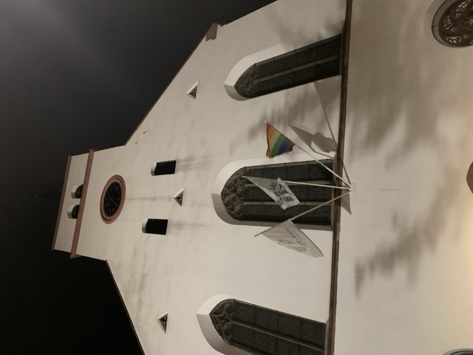 The image displays the illuminated facade of the Église protestante Saint-Guillaume (Saint William's Protestant Church) in Strasbourg, France, at night. The view is an upward angle, encompassing the lower part of the spire and the upper section of the church's main wall. The church's exterior is predominantly white plaster, contrasting with reddish-brown trim around windows and the roofline. A central clock tower features a circular clock face with dark numerals, positioned above two rectangular, dark-recessed windows. Below these, two small, triangular decorative recesses are visible. The lower section of the visible facade presents three tall, pointed-arch windows with dark, intricate tracery. Mounted on the wall between the two rightmost pointed-arch windows, a white fixture holds three flags on poles angled upwards. From left to right: the first flag is white with dark text that includes "Shalom Corps" and "STRASBOURG"; the second is also white with dark text, partially legible as "COMMUNI... TALMUD"; and the third is a six-stripe rainbow flag. Artificial lighting from below casts distinct, elongated shadows of the flags and other architectural features onto the white wall. The sky above is uniformly dark. No people are present in the scene.