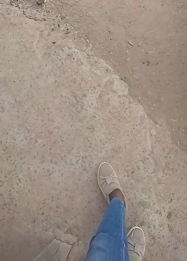 person from the waist down wearing blue jeans and light brown slip-on shoes. The person is standing on a rough, patchy surface that appears to be a combination of dirt and concrete. A car wheel is visible in the top right corner of the frame. The camera is positioned looking down at the person's feet.
