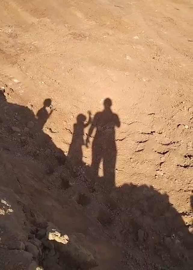 wide shot of a sunny, arid environment with a reddish-brown, cracked dirt ground. In the lower left portion of the frame, there is a rocky, uneven incline. The shadows of four individuals are cast upon the ground and the incline. One shadow seems to be that of an adult holding hands with a child. Another shadow appears to be that of a separate child figure standing apart. The fourth shadow is partially obscured. In the background, at the top of the frame, there is a flat dirt road or path with some minor tire tracks visible. The overall scene suggests an outdoors setting, possibly a construction site or an area with exposed soil.