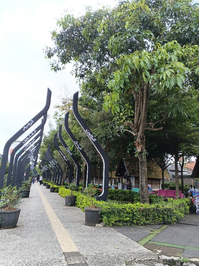 The image displays a pedestrian pathway in thành phố Biên Hòa, Vietnam, under an overcast sky. The pathway, paved with grey aggregate material and featuring a central yellow tactile guidance strip, extends from the foreground toward the background. Along the left side of the pathway, a linear series of approximately fifteen black, upward-curving arch-like structures stands, each inscribed with white Arabic calligraphy including phrases such as "الرحمن" (Ar-Rahman), "القدوس" (Al-Quddus), "السلام" (As-Salam), and "الرحيم" (Ar-Rahim). Dark grey potted plants are regularly spaced between these structures and a parallel low, manicured green hedge on the right. Beyond the hedge, a dense canopy of large trees with green foliage partially obscures several small background structures featuring rustic, possibly thatched or tiled, roofs, suggesting vendor stalls or small eateries. Some colorful outdoor seating, including pink and turquoise items, is visible near these structures. Multiple individuals are observed walking on the distant section of the pathway, moving away from the viewer. An additional person is partially visible on the far right, adjacent to the background structures.