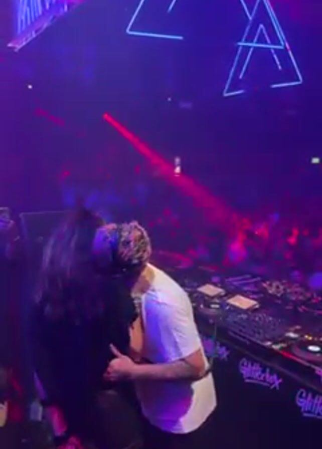 DJ in a white shirt and headphones dancing with a woman in a black top behind a DJ deck in a crowded nightclub. The DJ has tattoos on his arms and pinkish hair. The woman has long, dark curly hair. The DJ deck has "Glitterbox" printed on it. Above the DJ are two large, glowing blue triangles. Red spotlights scan the room. The crowd is visible in the background.