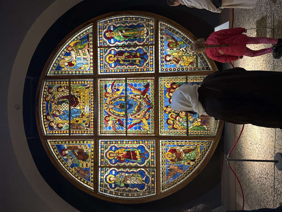 - "A large, circular stained-glass window with a dark, segmented frame is centrally displayed against a dark, curved wall" by FM-IdNfF2, licensed under CC BY 4.0