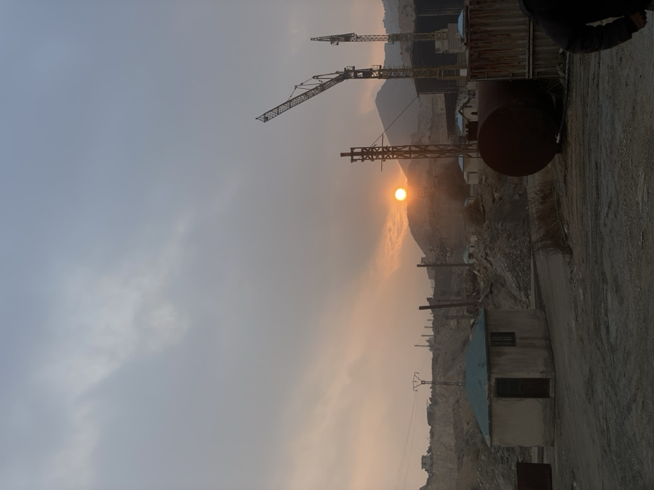 A dusty, hazy landscape features construction cranes silhouetted against an orange sunset