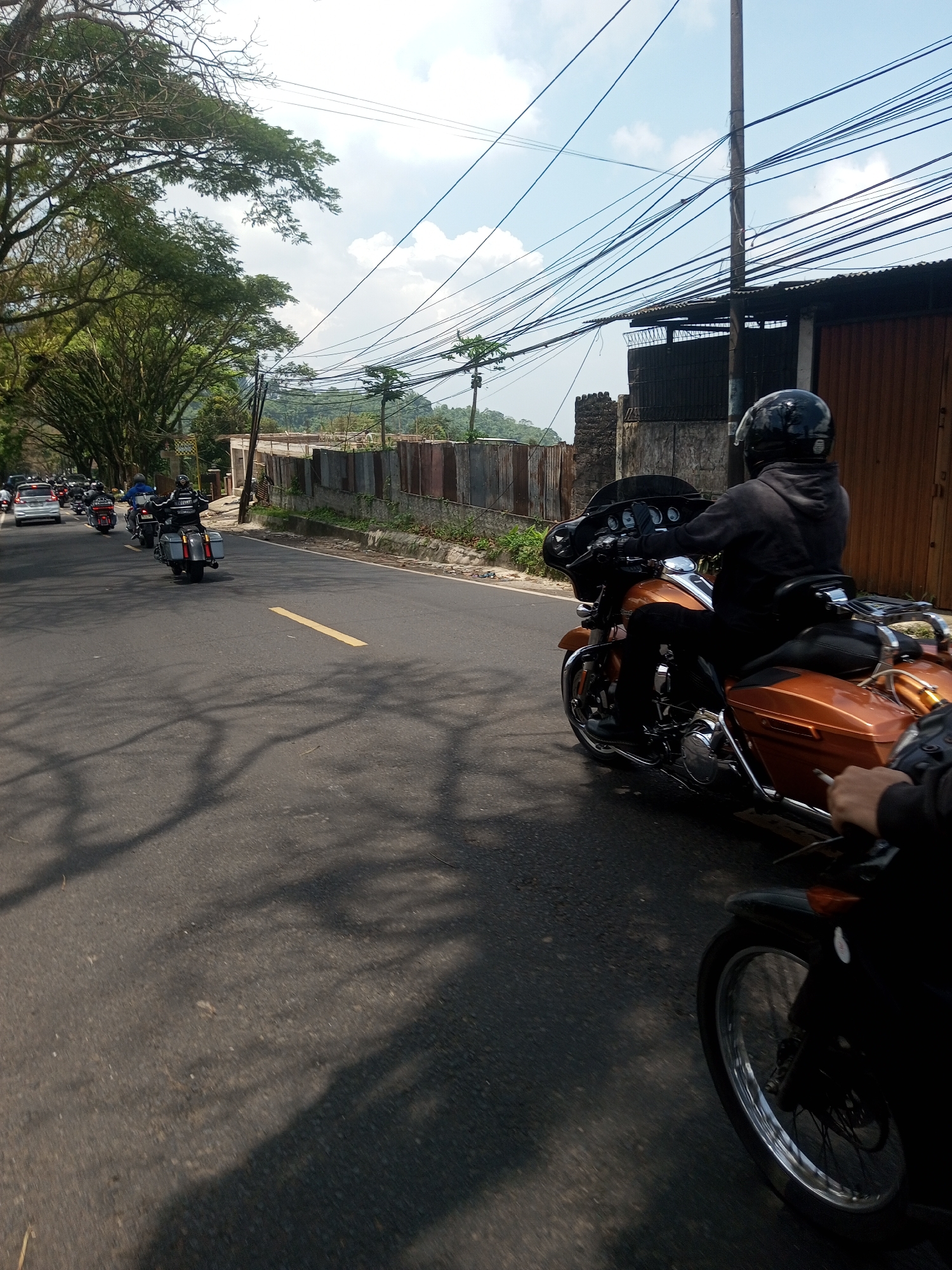The image depicts a motorcycle convoy on a paved road, with trees lining one side and buildings on the other