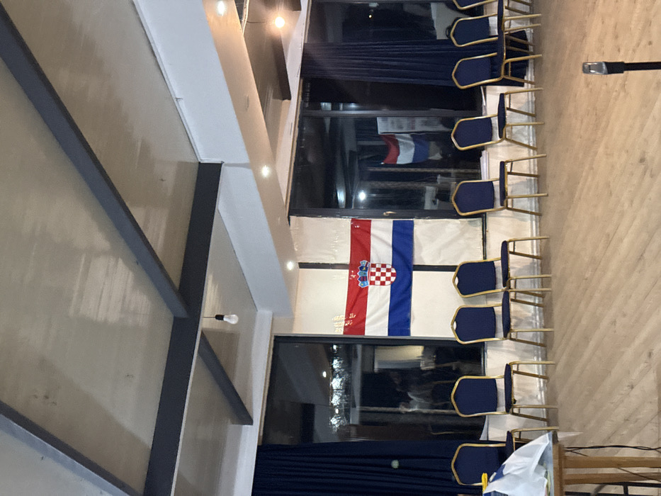 The image depicts an indoor event space, likely a function room or hall, located in Bakuriani, Georgia. A Croatian flag, featuring horizontal red, white, and blue stripes with the national coat of arms, is prominently displayed across a window and adjacent wall section in the background. A reflection resembling a Dutch flag (red, white, and blue horizontal stripes) is visible in a glass panel further to the right. In the midground, a linear arrangement of at least nine identical chairs with blue fabric upholstery and gold-colored metal frames are positioned facing forward. These chairs are currently unoccupied. To the far left, a portion of a light-colored wooden table with a white object, possibly a bag or draped cloth, is visible. The foreground on the lower right shows the base of a black microphone stand. The background consists primarily of large window panels, some partially covered by dark blue curtains. One window section is taped with white material. Reflections in the windows show dimly lit interior spaces or an outdoor environment, with indistinct figures vaguely discernible. The ceiling is constructed with light-colored panels and supported by dark grey structural beams. Various light sources are present, including a suspended bare bulb and recessed spotlights. The floor is light-colored wood. No specific individuals are clearly identifiable or engaged in actions within the primary scene.