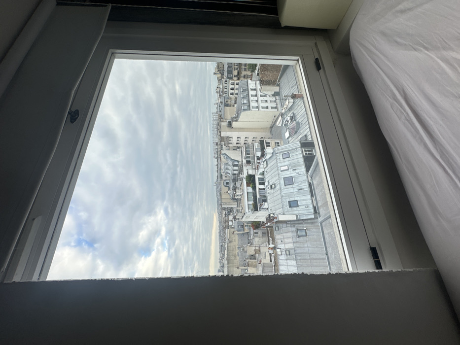 The image depicts a panoramic view of the city of Paris, France, observed from an interior room through a large, white-framed window