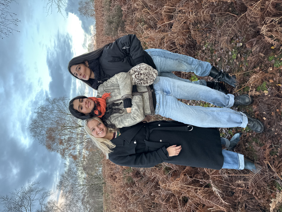 Three young adult females are depicted standing outdoors in a natural environment characterized by dense, dried reddish-brown bracken and scattered bare deciduous trees under an overcast sky with grey clouds. This setting is consistent with heathland or open woodland, likely within or near Stafford, United Kingdom. From left to right: 1. A female with blonde hair and a light complexion, wearing a black double-breasted trench coat over light blue cuffed jeans and dark ankle boots. She leans her head on the shoulder of the central figure and smiles towards the camera. 2. A female with dark hair and a medium complexion stands centrally, wearing an orange knitted scarf, an olive green distressed jacket with a dark shearling collar and cuffs, dark gloves, light blue cuffed jeans, and dark lace-up boots. Her arms are crossed, and she exhibits a faint smile towards the camera. 3. A female with dark hair and a medium complexion wears a black puffer jacket with a dark fur collar, light blue jeans, and black tall boots. She holds a light-colored, leopard-print textured bag against her hip and has pursed lips, looking towards the camera. The individuals are posed in close proximity.