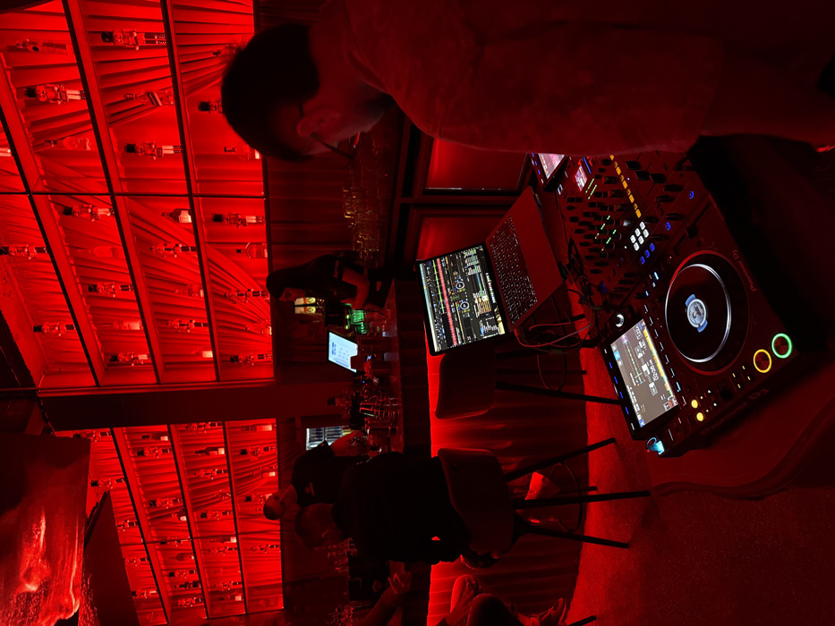 The scene depicts the interior of a nightclub or bar located in Varna, Bulgaria, characterized by pervasive red ambient lighting. In the foreground, a person, seen from the back and right shoulder, stands facing a professional DJ setup. This setup includes a Pioneer DJ controller with illuminated buttons (green, orange, blue), and a silver laptop (likely a MacBook Pro) displaying DJ software with waveforms, positioned on a stand above the controller. Cables connect the laptop to the DJ equipment. In the mid-ground, a dark bar counter stretches across the frame. Behind the bar, two individuals, identified as bartenders (one male, one female), are engaged in their duties; the female bartender is observed looking at a digital screen. Various bar tools, shakers, glassware, and additional bottles are visible on the bar surface. Several patrons are seated on dark bar stools along the counter, with at least one individual clearly visible from the back. The background features a prominent, multi-tiered shelving unit extending across the entire wall behind the bar. This unit is intensely backlit with red light, illuminating numerous liquor bottles arranged uniformly on each shelf. White fabric or drapery is visible behind the bottles, contributing to the strong red light diffusion. The floor and other surfaces exhibit reflections consistent with the intense red illumination.