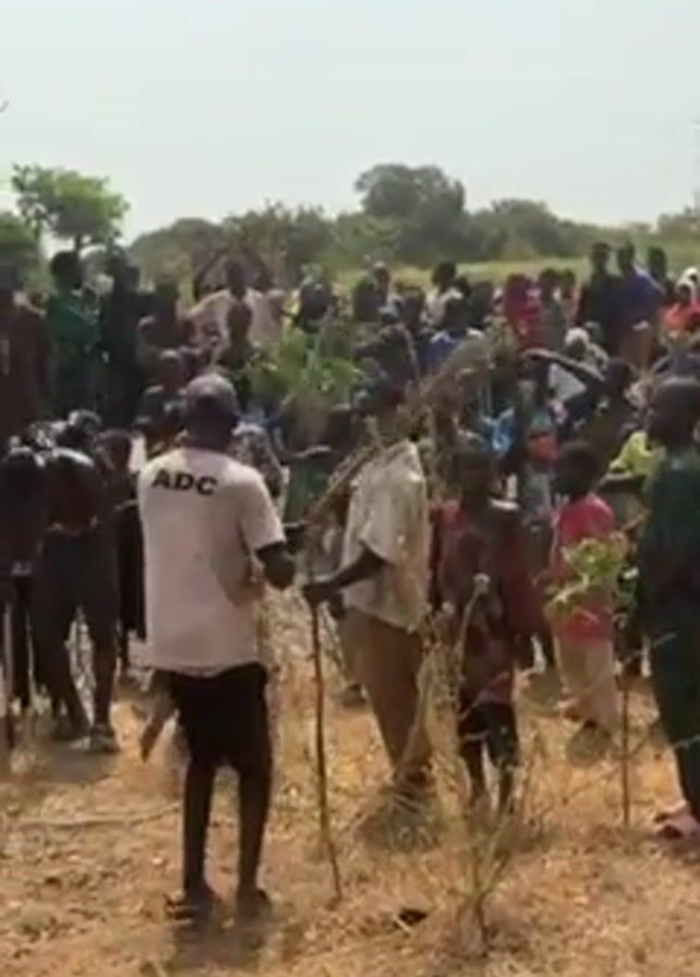 large crowd of people outdoors in a rural area. The crowd consists of men, women, and children, many of whom are wearing casual clothing, while some are dressed in what appear to be traditional garments. Some members of the crowd are carrying branches or sticks. A man wearing a white t-shirt with the letters "ADC" printed on it is visible near the foreground. The background features sparse vegetation and a tall electrical transmission tower. The atmosphere appears lively with people moving and gesturing, suggesting a gathering or event of some kind.