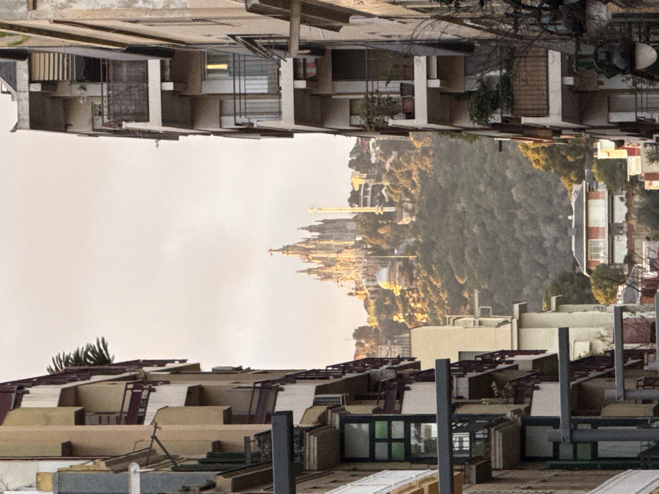 The image depicts an upside-down urban scene with two distinct layers. The upper layer features modern residential buildings with balconies and windows. The central area showcases a hillside adorned with trees, buildings, and structures resembling towers or monuments bathed in a warm, golden light. The bottom layer mirrors the upper one, displaying similar residential structures, creating a symmetrical and surreal effect. A hazy or overcast sky fills the remaining space.