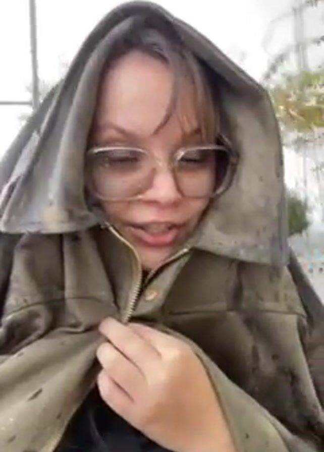 A fair-skinned person with bangs and clear glasses is recording a close-up video of themself. The person is wearing a large, hooded, olive-colored jacket with a gold zipper that is slightly unzipped. The jacket has spots on it. The person is outside and there is a slightly out-of-focus background of trees and power lines. The person is singing while looking directly into the camera and fidgeting with the jacket zipper.
