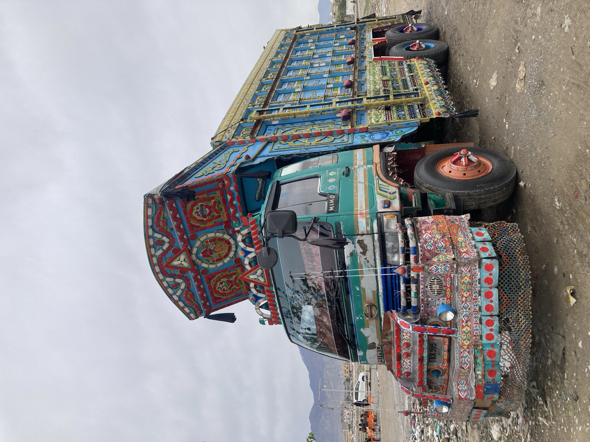 A heavily decorated Hino truck sits in what appears to be a parking lot or open area in Quetta City Tehsil, Pakistan. The truck is adorned with vibrant colors and intricate designs, covering its exterior. Mountains are visible in the background, and trash litters the foreground. The truck has a green cab, blue container and a lot of red, yellow and white patterns.