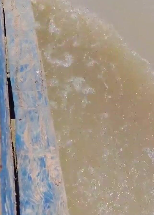From an elevated perspective near the edge of a vessel, possibly a boat or barge, the video shows churning, muddy-looking water