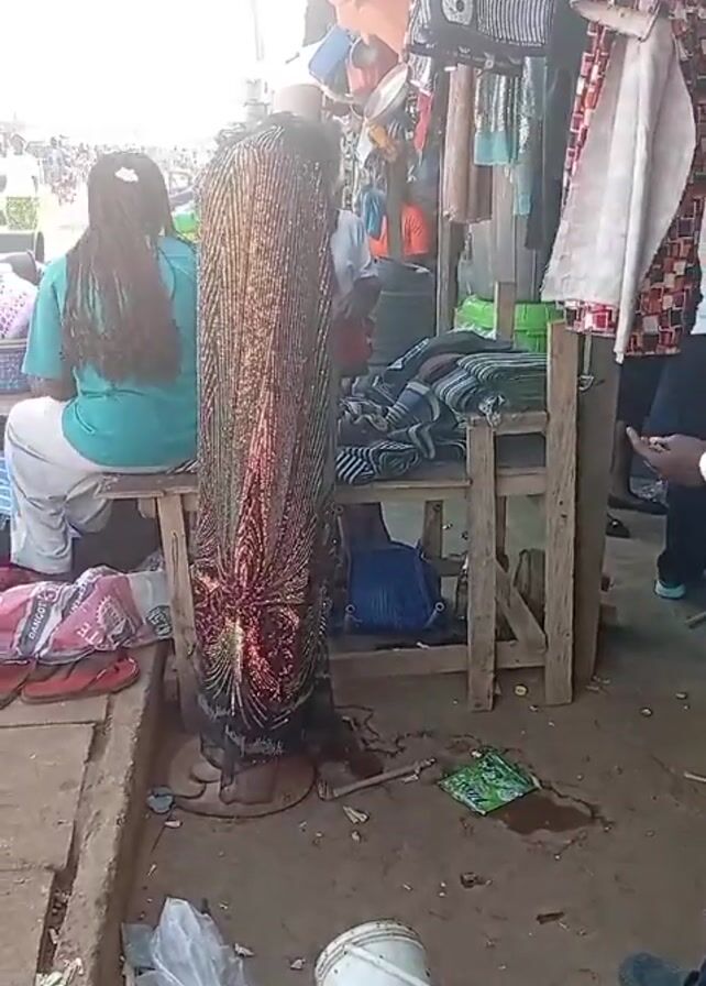 busy outdoor marketplace. A woman in a long, sparkly gown is standing near a display of textiles. Another woman is seated on a wooden stool behind her. There are various items for sale hanging from the stall's structure, including bags and fabrics. A man in a white shirt and dark pants stands to the right, holding a phone or tablet and examining fabric patterns. The ground is littered with trash. The atmosphere seems active with people moving around.