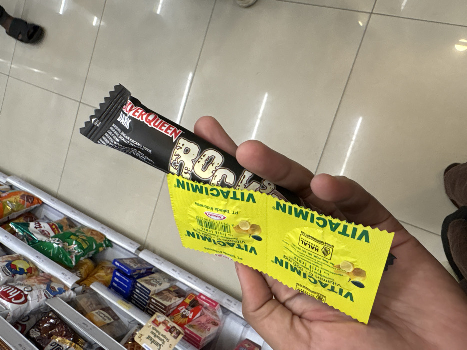 - "A right hand, likely belonging to an adult, holds two yellow blister packs of "VITACIMIN Vitamin C 500 mg" and one black "SILVERQUEEN DARK" chocolate bar" by FM-2PA203, licensed under CC BY 4.0