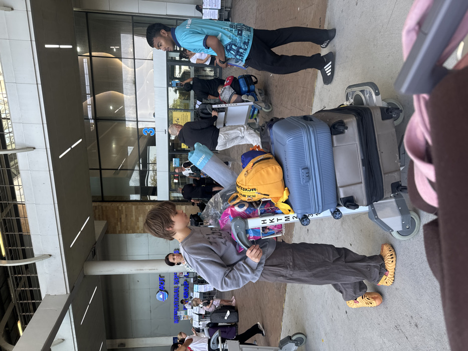 At an airport terminal, a young person in a gray sweatshirt, brown pants, and yellow shoes pushes a luggage cart loaded with suitcases, a yellow backpack, and other items. A man in a turquoise shirt and black pants stands beside a line of people with their luggage carts waiting to be processed. The airport exterior has large windows and signage.