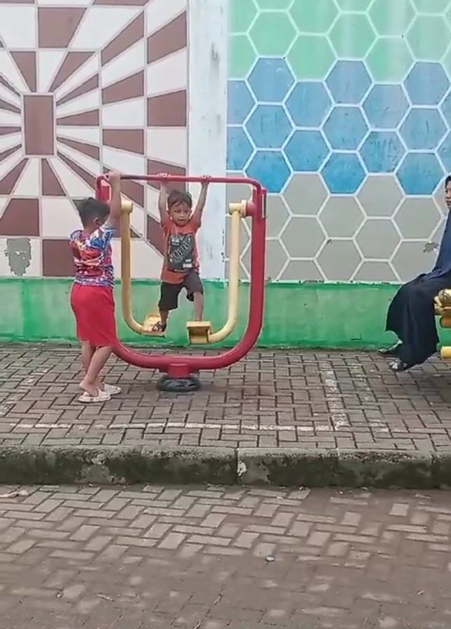 two young boys and a woman on a paved public square. The boys are interacting with a piece of exercise equipment, which is red and yellow and designed for leg swings. The younger boy is standing on the platform of the equipment, holding onto the handles, while the older boy stands beside him holding the equipment steady. The woman is seated on a nearby bench. Behind the group is a painted wall with geometric patterns in brown, white, blue, and green. The ground is paved with dark brick arranged in a herringbone pattern.