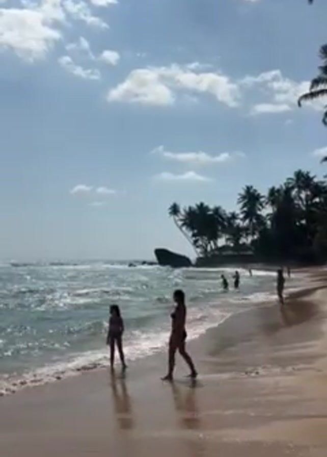 tropical beach with several people. In the foreground, a woman and a child stand near the water's edge. The woman is wearing a bikini. The child wears a swimsuit. They are walking along the shoreline as waves break. In the background, other individuals can be seen further down the beach. The sky is partly cloudy with a blue hue. Palm trees line the edge of the beach. Rocks are visible in the ocean.