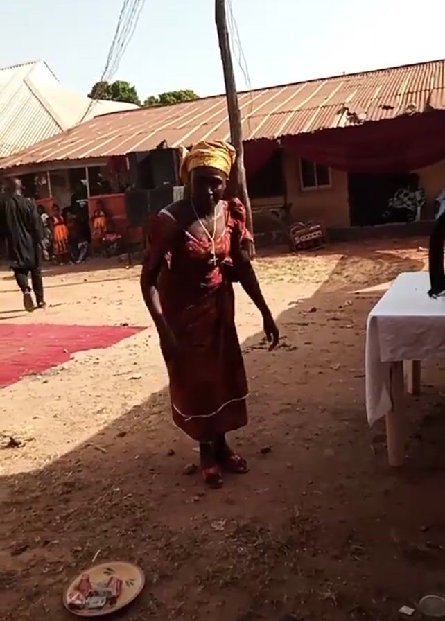 n outdoor celebration. A woman in a red dress with gold headwrap dances in the dusty yard. Under a pink and gold-draped tent, two men sit and play drums. Other guests sit in rows behind them. A table draped in white is nearby. A man in black walks away from the celebration along a red carpet toward a building. Another rustic building is in the background. The sky is bright.