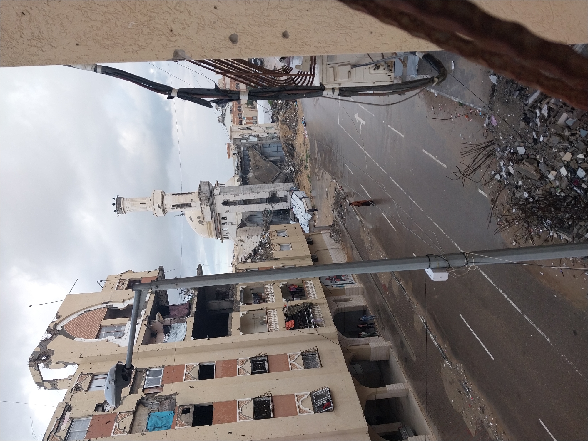 The image depicts a street scene in Khan Yunis, Palestinian Territory, under an overcast sky. A multi-story, light-beige building on the left exhibits extensive structural damage, including missing windows, sections of its facade collapsed or blown away, and numerous impact marks consistent with bullet holes on its exterior walls. Visible interiors are exposed through damaged areas, and various items, including blue fabrics and what appears to be laundry, hang from several damaged balconies. Beneath the building's ground-floor arcades, three to four individuals are congregated. In the mid-ground, a damaged white mosque structure featuring a tall minaret with multiple loudspeakers and a dome is visible, surrounded by substantial rubble and debris. The central element is a wet, two-lane asphalt road with white lane markings, including a painted turn arrow. One individual, wearing a dark brown outer garment, walks on the road away from the viewer. The shoulders of the road are heavily strewn with debris, comprising shattered concrete, twisted rebar, and miscellaneous waste. A grey street lamp post stands centrally in the foreground. On the right, bundled electrical cables are attached to a textured, light-colored building facade, which also displays impact marks consistent with bullet holes, suggesting the viewpoint is from this structure.