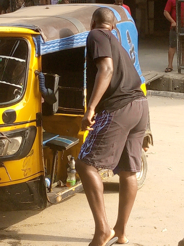 A man stands near a yellow and blue auto rickshaw (tuk-tuk). He is wearing a black t-shirt, brown shorts with blue designs, and sandals. The rickshaw has a black seat and a bottle placed on the floor. A person in a red shirt and shorts is visible in the background, along with a concrete curb. The scene is brightly lit.